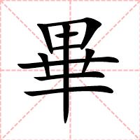 “畢” 字共有 10 画,拼音:bì,注音:ㄅㄧˋ,部首:田,笔画数:10 画,字体结构:独体字,五行:水,五笔:JAFK,Unicode编码:U+7562,郑码:KEBI,仓颉:WTJ,“畢”字笔顺为: