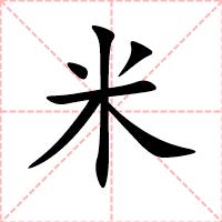(象形,甲骨文字形。象米粒琐碎纵横之状。“米”是汉字的一个部首,从“米”的字与米、粮有关。本义:谷物和其他植物子实去壳后的子实)