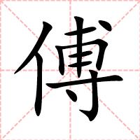 “傅” 字共有 12 画,拼音:fù,注音:ㄈㄨˋ,部首:亻,笔画数:12 画,字体结构:左右结构,五行:水,五笔:WGEF,Unicode编码:U+5085,郑码:NFDS,仓颉:OIBI,“傅”字笔顺为:ノ丨一丨フ一一丨丶一丨丶: 撇、竖、横、竖、横撇、横、横、竖、点、横、竖、点
