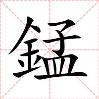 “錳” 字共有 16 画,拼音:měng,注音:ㄇㄥˇ,部首:釒,笔画数:16 画,字体结构:左右结构,五行:金,五笔:QBLG,Unicode编码:U+9333,郑码:PYLK,仓颉:CNDT,“錳”字笔顺为: