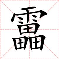 “靁” 字共有 23 画,拼音:léi,注音:ㄌㄟˊ,部首:雨,笔画数:23 画,字体结构:上下结构,五行:水,五笔:FLLL,Unicode编码:U+9741,郑码:FVKK,仓颉:MBWWW,“靁”字笔顺为: