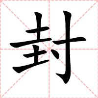 (会意。金文字形,左边象土上长着丰茂的树木形,右边是一只手(又,后来写作“寸”),表示聚土培植。《说文》:“封,爵诸侯之土也。从之从土从寸。”郭沫若曰:“古之畿封实以树为之也。此习于今犹存。然其事之起,乃远在太古。太古之民多利用自然林木以为族与族间之畛域,西方学者所称为境界林者是也。”。李孝定曰:“封之本义当以郭说为是,许训乃后起之义。字象植树土上,以明经界。爵诸侯必有封疆,乃其引申义。”本义:疆界;田界)