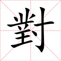 “對” 字共有 14 画,拼音:duì,注音:ㄉㄨㄟˋ,部首:寸,笔画数:14 画,字体结构:左右结构,五行:火,五笔:OGUF,Unicode编码:U+5C0D,郑码:KUUD,仓颉:TGDI,“對”字笔顺为: