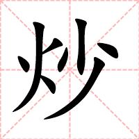 “炒” 字共有 8 画,拼音:chǎo,注音:ㄔㄠˇ,部首:火,笔画数:8 画,字体结构:左右结构,五行:火,五笔:OITT,Unicode编码:U+7092,郑码:UOKM,仓颉:FFH,“炒”字笔顺为: