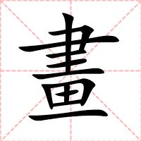 “畫” 字共有 12 画,拼音:huà,注音:ㄏㄨㄚˋ,部首:田,笔画数:12 画,字体结构:上中下结构,五行:木,五笔:VFLG,Unicode编码:U+756B,郑码:XBKA,仓颉:LGWM,“畫”字笔顺为: