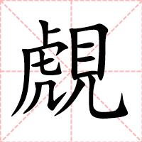 “覤” 字共有 15 画,拼音:xì,注音:ㄒㄧˋ,部首:見,笔画数:15 画,字体结构:左右结构,五行:金,五笔:HAMQ,Unicode编码:U+89A4,郑码:IHLR,仓颉:YNBUU,“覤”字笔顺为: