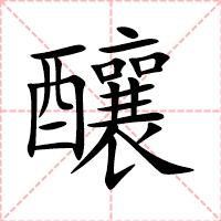 “釀” 字共有 24 画,拼音:niàng,niáng,注音:ㄋㄧㄤˋ,ㄋㄧㄤˊ,部首:酉,笔画数:24 画,字体结构:左右结构,五行:火,五笔:SGYE,Unicode编码:U+91C0,郑码:FDER,仓颉:MWYRV,“釀”字笔顺为: