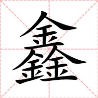 “鑫” 字共有 24 画,拼音:xīn,注音:ㄒㄧㄣ,部首:金,笔画数:24 画,字体结构:上下结构,五行:金,五笔:QQQF,Unicode编码:U+946B,郑码:PPP,仓颉:CCC,“鑫”字笔顺为: