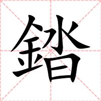 “錔” 字共有 16 画,拼音:tà,注音:ㄊㄚˋ,部首:釒,笔画数:16 画,字体结构:左右结构,五行:金,五笔:QIJG,Unicode编码:U+9314,郑码:PKK,仓颉:CEA,“錔”字笔顺为: