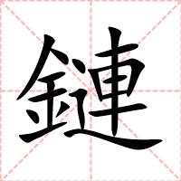 “鏈” 字共有 18 画,拼音:liàn,注音:ㄌㄧㄢˋ,部首:釒,笔画数:18 画,字体结构:左右结构,五行:金,五笔:QLPY,Unicode编码:U+93C8,郑码:PFW,仓颉:CYJJ,“鏈”字笔顺为: