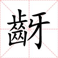 “齖” 字共有 19 画,拼音:yá,注音:ㄧㄚˊ,部首:齒,笔画数:19 画,字体结构:左右结构,五行:金,五笔:HWWT,Unicode编码:U+9F56,郑码:IOHI,仓颉:YUMVH,“齖”字笔顺为: